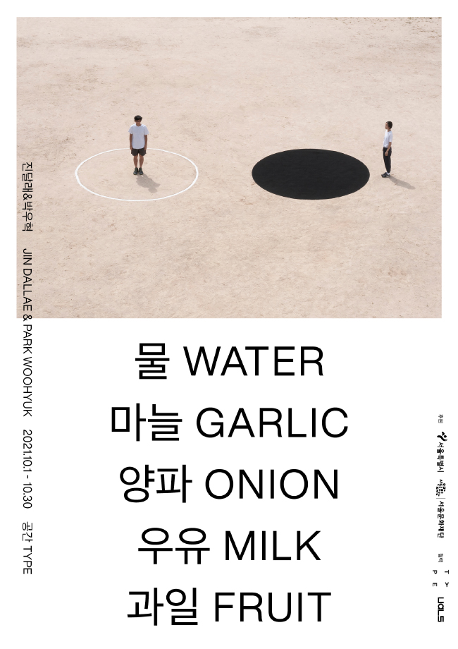 공간 TYPE에서 열리는 《물 마늘 양파 우유 과일》에서는 사회에 대한 관찰을 패턴화한 스코어를 기반으로 영상, 설치, 퍼포먼스를 선보인다. 개인전 《사자, 마녀 그리고 옷장》(구슬모아당구장, 2015), 《Crescendo: Dot, Dot, Dot, Dot》(스페이스윌링앤딜링, 2018)과 단체전 《예기치 않은》(국립현대미술관 다원예술프로젝트, 2016)의 〈움직이는 현재〉, 《행복이 나를 찾는다》(세종문화회관 미술관, 2020)의 〈The Moment〉에서 보이듯, 작품 안에는 원과 삼각형, 직사각형, 선 등의 구조물이 공존하고, 이들은 각각 자신의 역할을 반복하여 수행한다. 그동안의 여러 작품에서 퍼포머는 마치 움직이는 조각처럼 거대한 구조물에서 주요한 요소로 작동하여 왔다. ‘반복’은 특히 진달래&박우혁이 관심을 갖고 있는 주제로 그들의 스코어 속의 작은 변주들은 사운드, 벽과 바닥을 가로지르는 선, 화면 속의 깜빡임 등으로 구현되고, 전시장의 시작과 끝을 모두 아우르면서 조화와 합일을 이룬다.